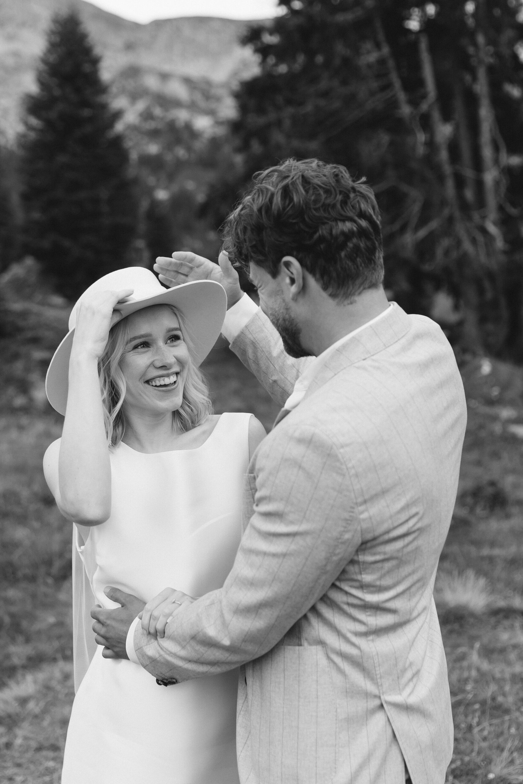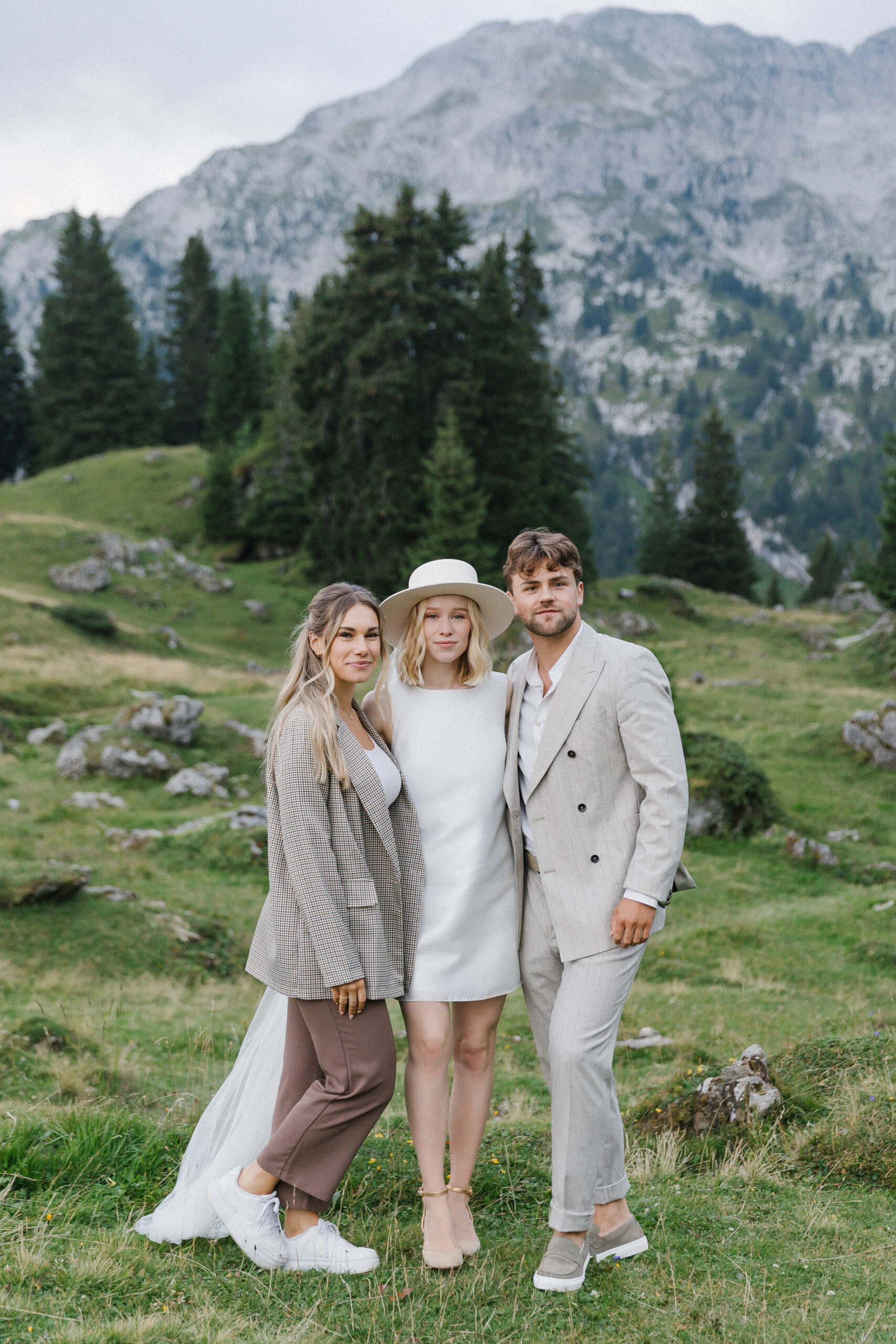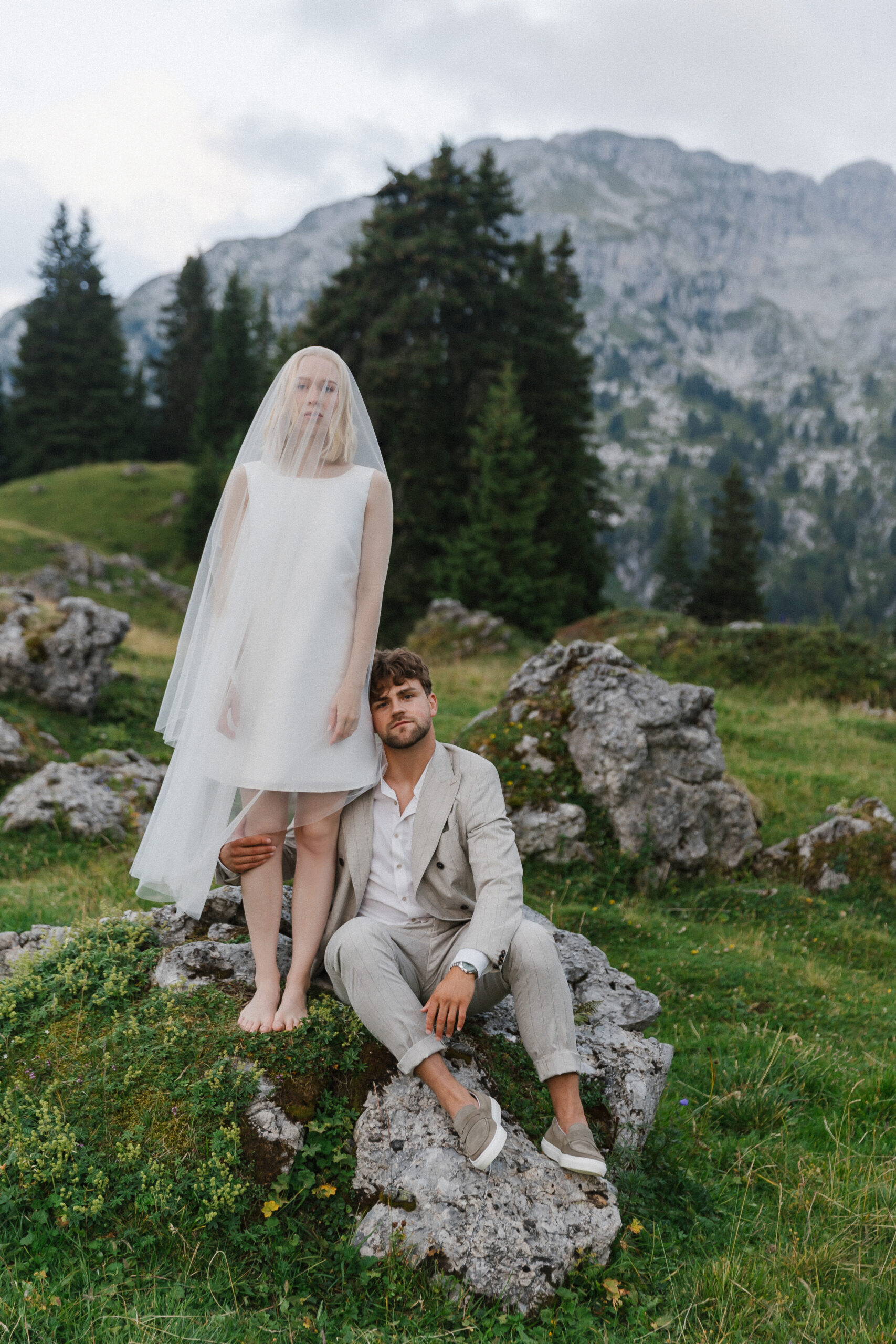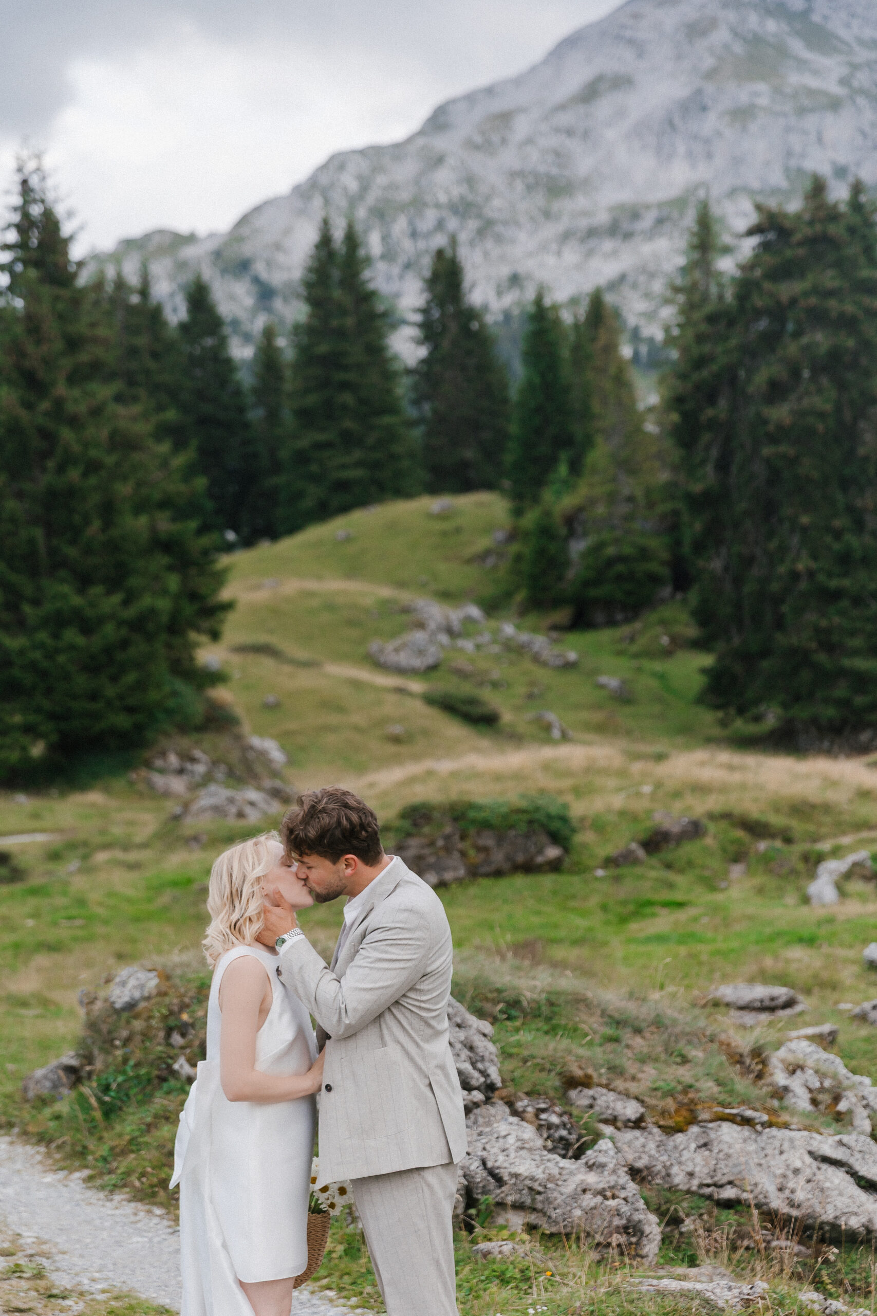 Das Paar in schlichten, eleganten Outfits unterstreicht den natürlichen Charakter der Szenerie: barfuss auf den Felsen, zwischen grünen Wiesen und dem glasklaren Bergsee. Statt prunkvoller Dekoration lag der Fokus auf Authentizität, Natur und purer Liebe – ein inspirierendes Beispiel dafür, wie wunderschön und tiefgehend eine Hochzeit zu zweit in den Bergen sein kann.