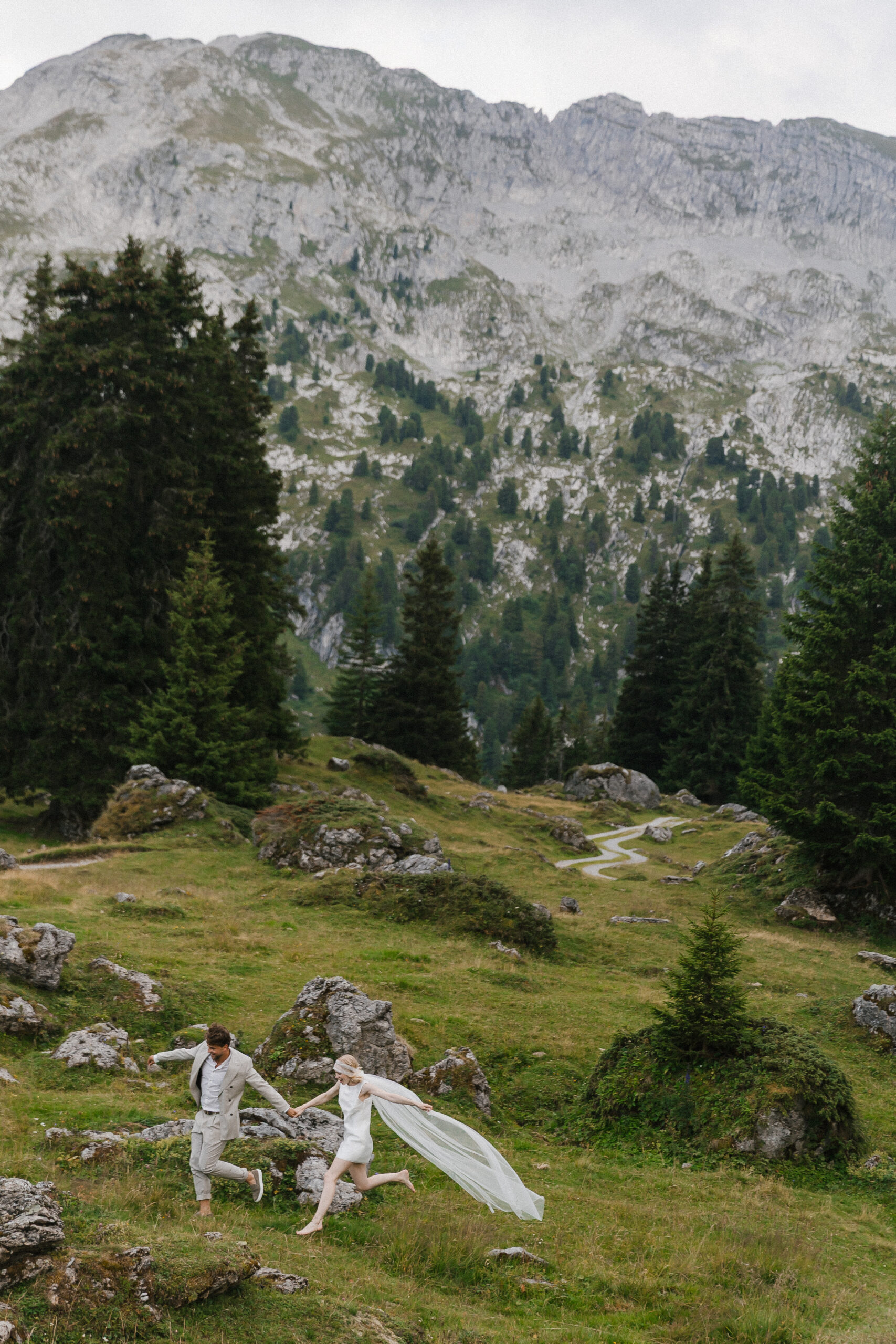 Mitten in der unberührten Natur der Schweizer Berge entstand dieses intime Elopement-Shooting am idyllischen Seebergsee im Berner Oberland. Gemeinsam mit einer Fotografin aus Russland wurde dieses Projekt umgesetzt, das die wilde Schönheit der Landschaft mit der Leichtigkeit und Freiheit einer modernen Elopement-Hochzeit verbindet.