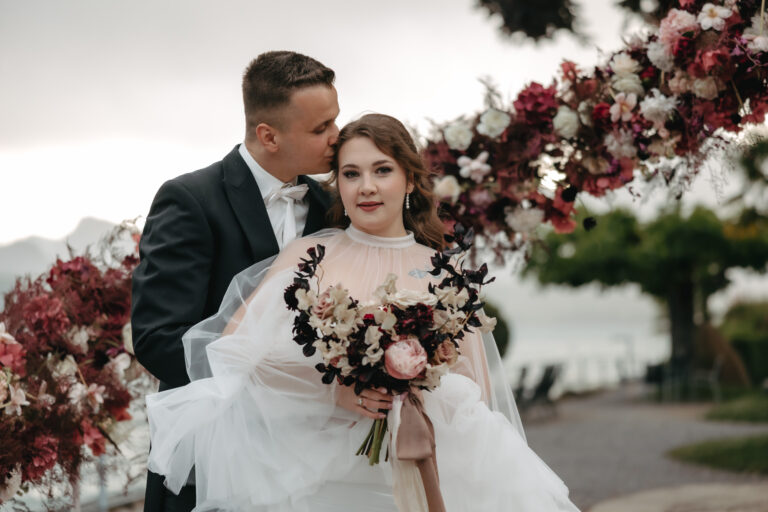Die Trauung wurde im romantischen Hotelgarten zelebriert, mit freiem Blick auf den Thunersee. Ein Höhepunkt war das symbolische Freilassen von Tauben, begleitet von Live-Musik der Sängerin Meli – ein Moment voller Emotionen. Das Bankett im eleganten Innenbereich spiegelte die edle und zugleich moderne Stilwelt des Tages wider: samtige Stoffe, dramatische Blumengestecke in Bordeaux, Rosa und Creme sowie eine eindrucksvolle Hochzeitstorte mit aufwendigen Drapierungen.